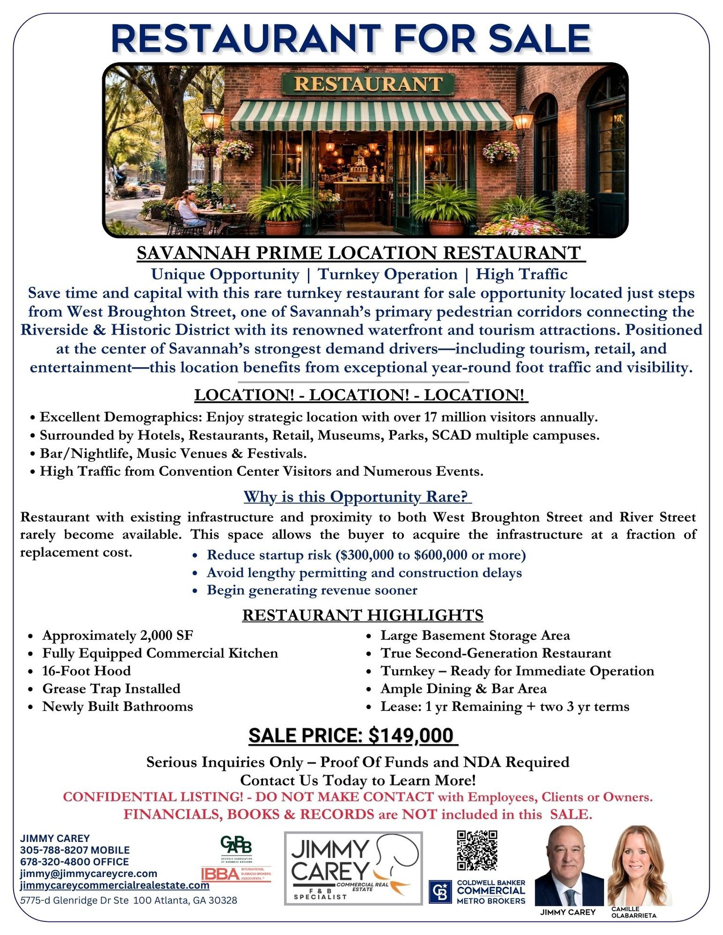 "When I look at this deal, I see what a smart operator sees: a fully equipped kitchen, a 16-foot hood, a grease trap, new bathrooms, and up to 9 years of lease stability — all in a Historic District address that took years to establish. Building this from scratch in Savannah would cost you half a million dollars and 12 months of your life. At $149,000 as an asset sale, you're not buying a restaurant. You're buying a head start." — Jimmy Carey, Atlanta's Premier Restaurant Broker